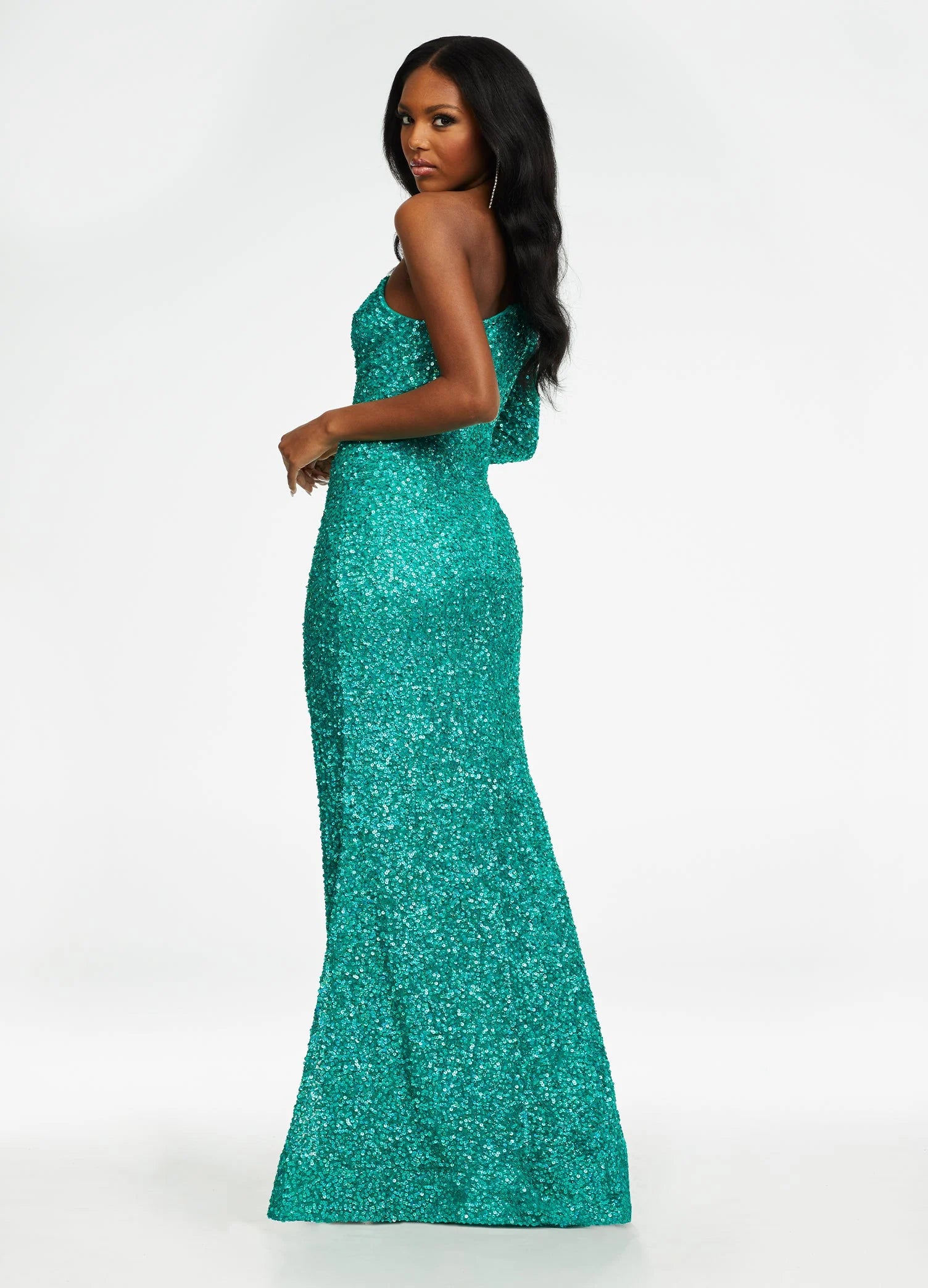 Fitted hand beaded dress featuring one sleeve and a left leg slit. The skirt is finished with horsehair.